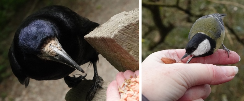 Closeup of a befriended rook and a great tit